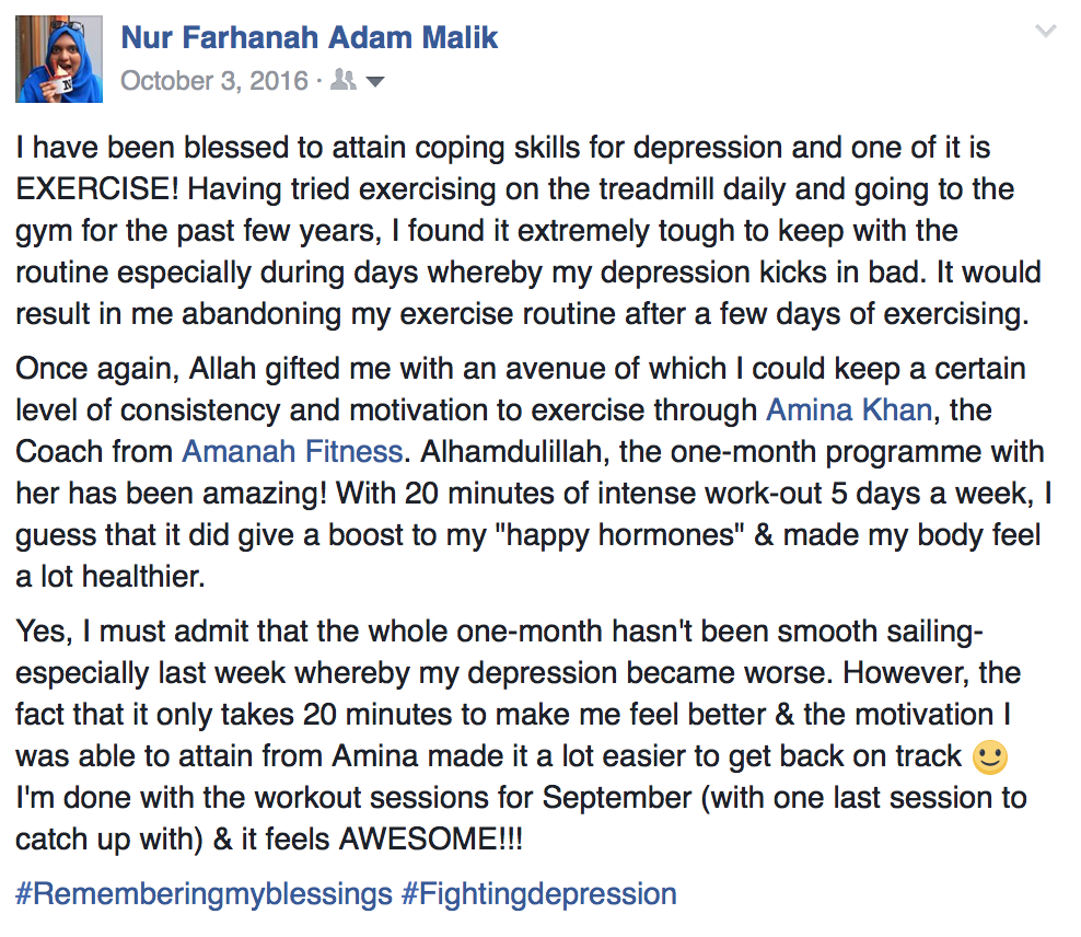Farhanah is now a member of Amina’s 30 Day Bootcamp Fat Loss Fitness Program for Muslim women. She describes the effect of exercise on her mental health and depression and encourages other sisters to use exercise as a means of coping, as well: